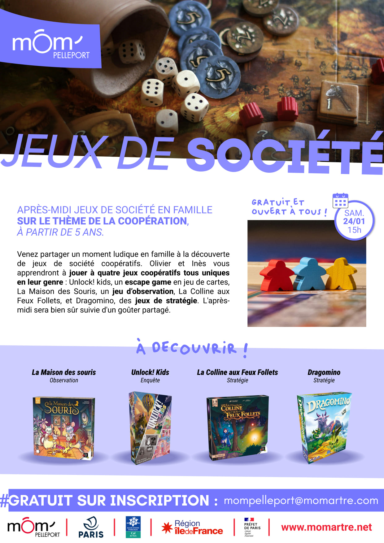 Venez partager un moment ludique en famille à la découverte de jeux de société coopératifs. Olivier et Inès vous apprendront à jouer à quatre jeux coopératifs tous uniques en leur genre : Unlock! kids, un escape game en jeu de cartes, La Maison des Souris, un jeu d’observation, La Colline aux Feux Follets, et Dragomino, des jeux de stratégie. L’après-midi sera bien sûr suivie d’un goûter partagé.