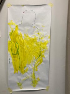 Lors des premières séances, l’artiste a invité les enfants à s’allonger sur de grandes feuilles de papier blanc afin d’y tracer le contour de leurs silhouettes. Par la suite, les enfants ont appliqué de la couleur sur leurs silhouettes en utilisant différentes techniques (pastels, feutres, encres, peinture maison). Lors des derniers ateliers, l’artiste a proposé aux enfants un temps dans la pénombre afin qu’ils puissent observer la projection de leurs ombres sur leurs silhouettes peintes. Une manière de les inviter à mieux appréhender leurs corps et l’espace qui les entoure.
