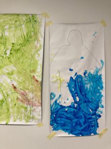 Lors des premières séances, l’artiste a invité les enfants à s’allonger sur de grandes feuilles de papier blanc afin d’y tracer le contour de leurs silhouettes. Par la suite, les enfants ont appliqué de la couleur sur leurs silhouettes en utilisant différentes techniques (pastels, feutres, encres, peinture maison). Lors des derniers ateliers, l’artiste a proposé aux enfants un temps dans la pénombre afin qu’ils puissent observer la projection de leurs ombres sur leurs silhouettes peintes. Une manière de les inviter à mieux appréhender leurs corps et l’espace qui les entoure.